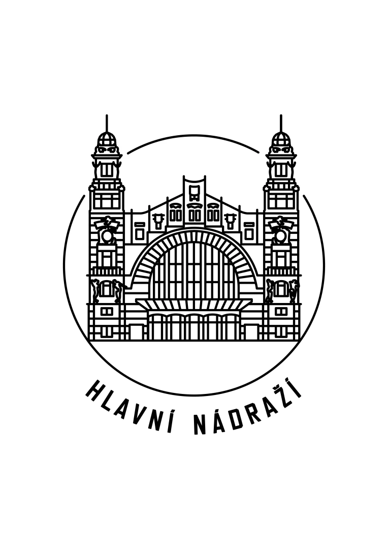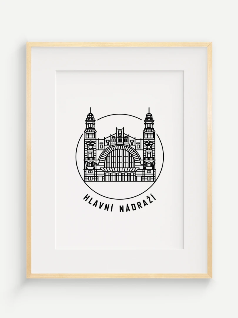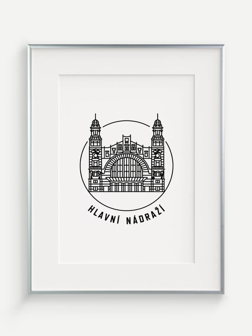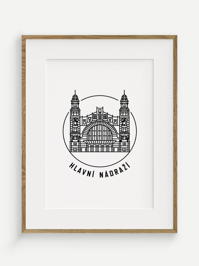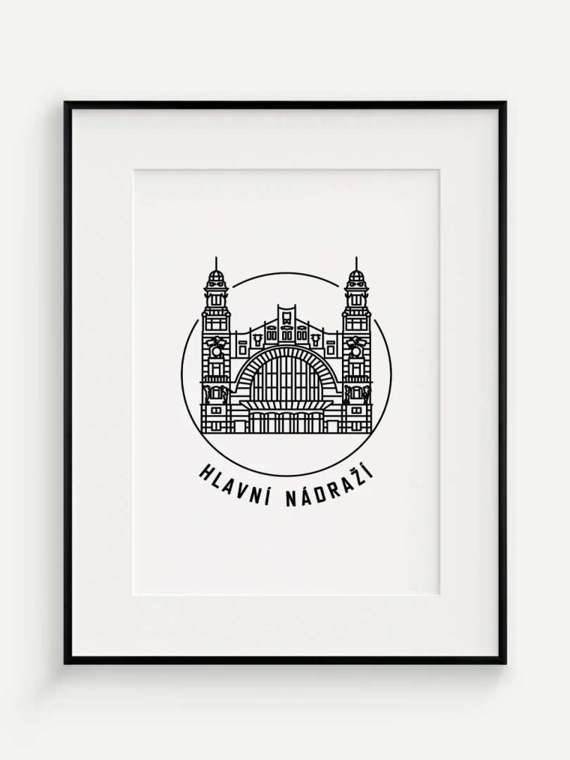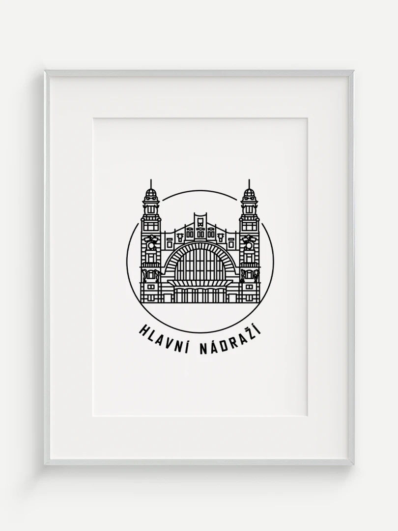 Tento print představuje stylizované, minimalistické zobrazení Hlavního nádraží v Praze, budovy, která spojuje historické a moderní architektonické prvky. Vytvořen jemnou černou linkovou kresbou na kvalitním papíře, tato ilustrace zachycuje čisté linie a elegantní detaily stanice v nadčasovém stylu.