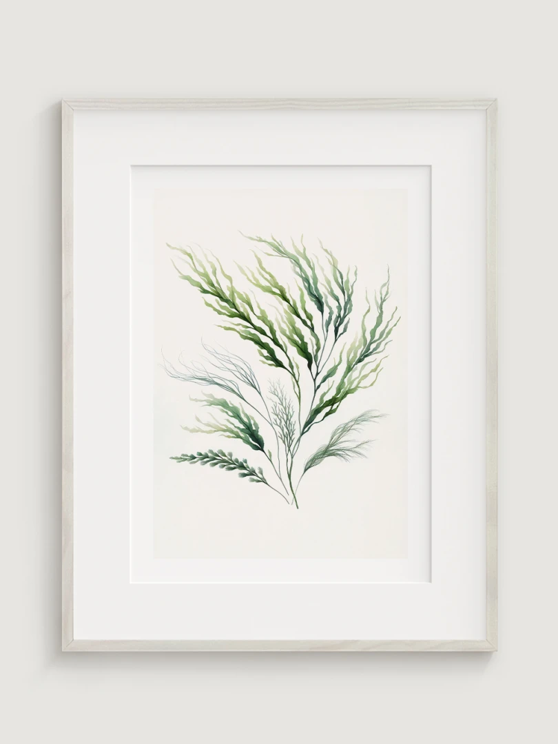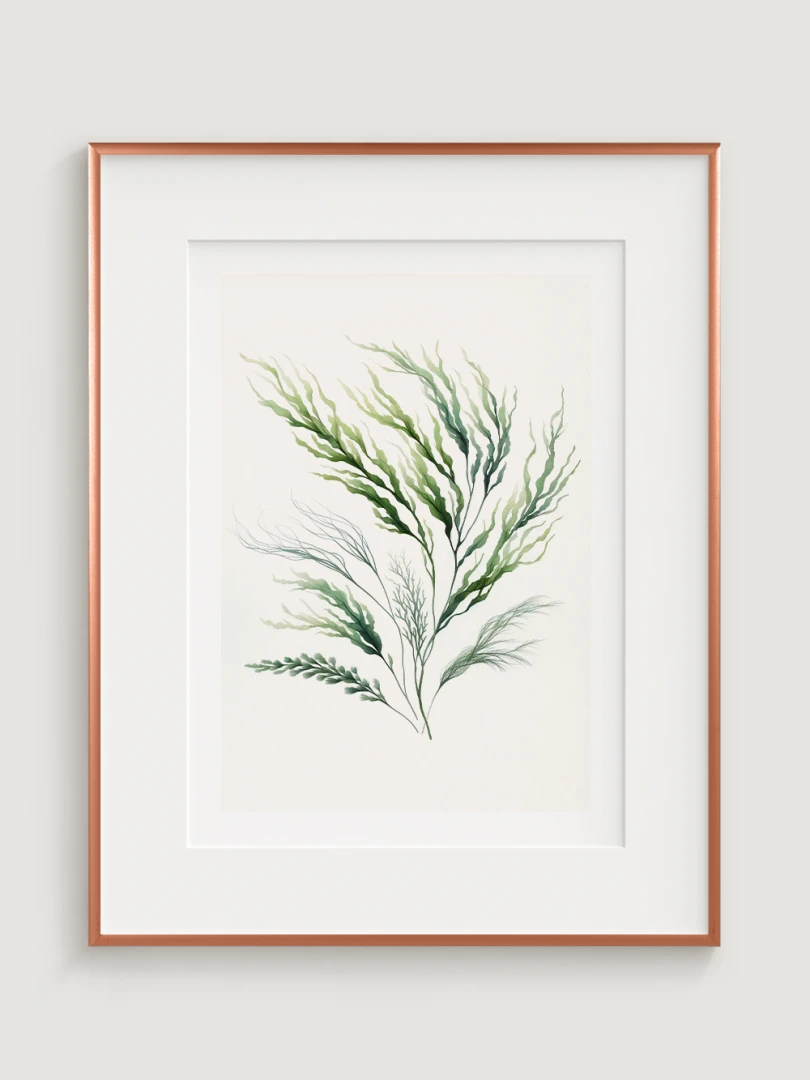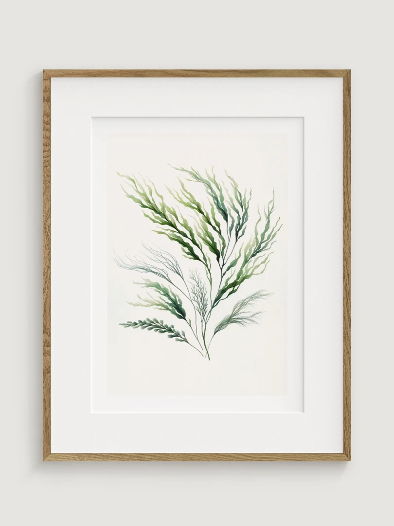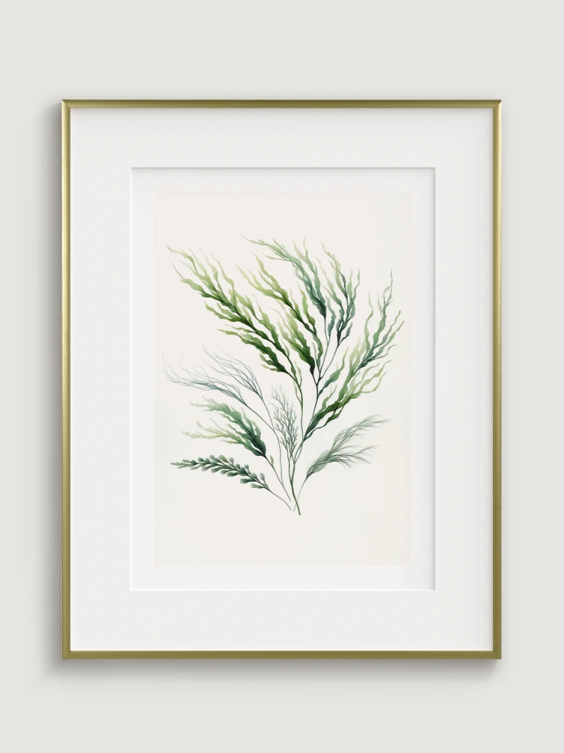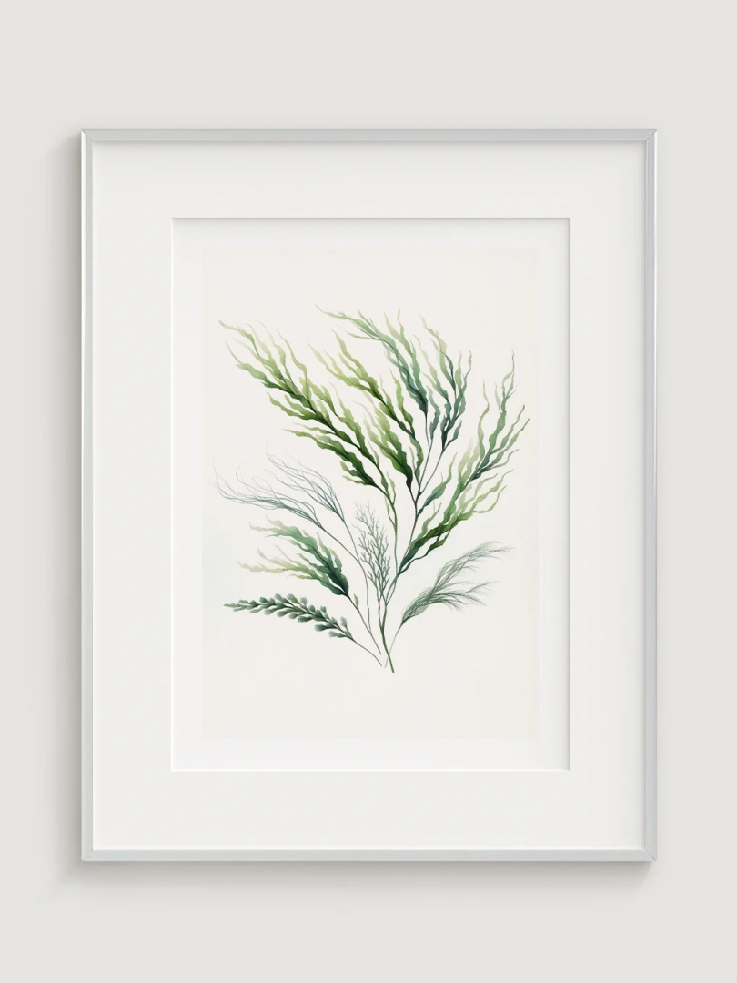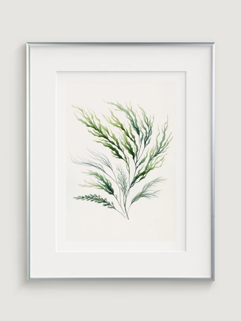 Toto dílo zobrazuje elegantní obraz mořské řasy s plynulými liniemi a živými zelenými odstíny, které zachycují organické, vlnité formy podvodní rostliny.