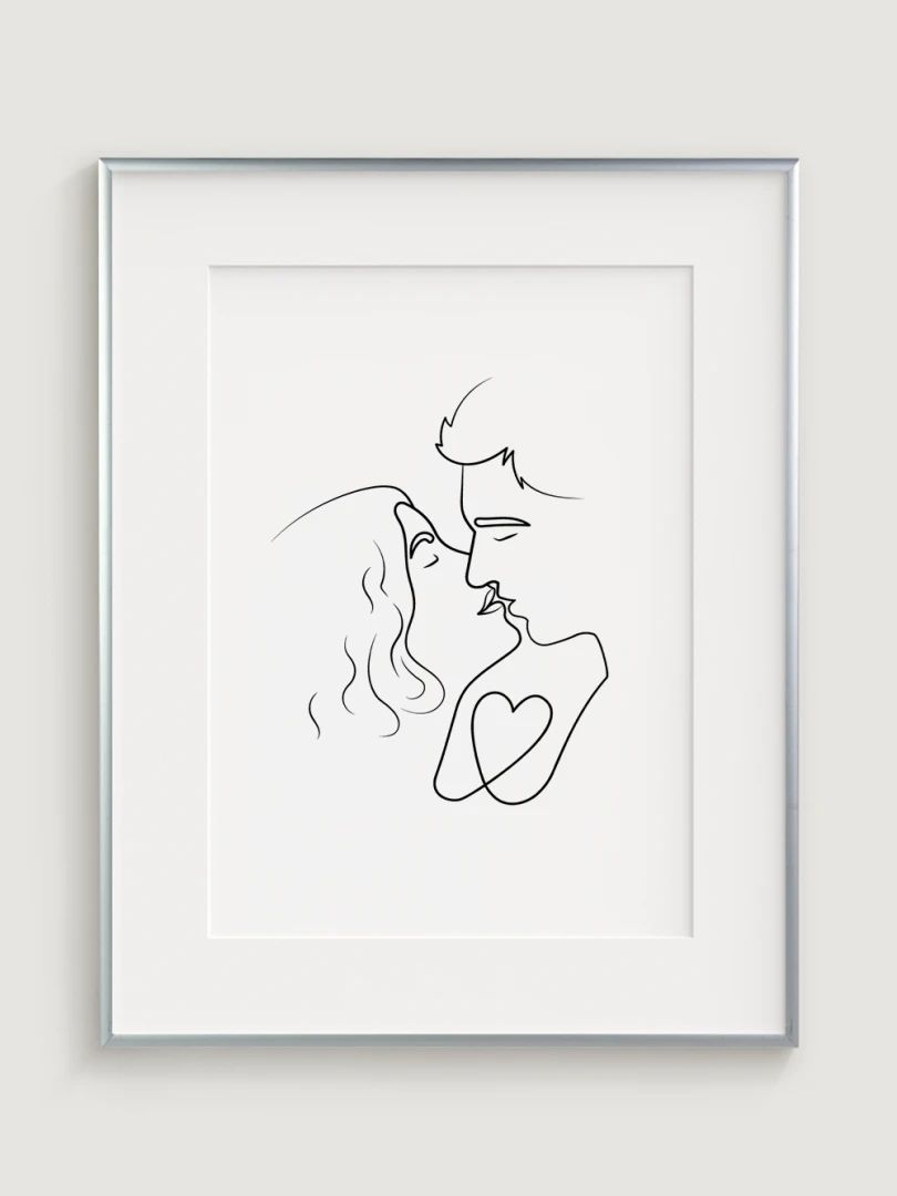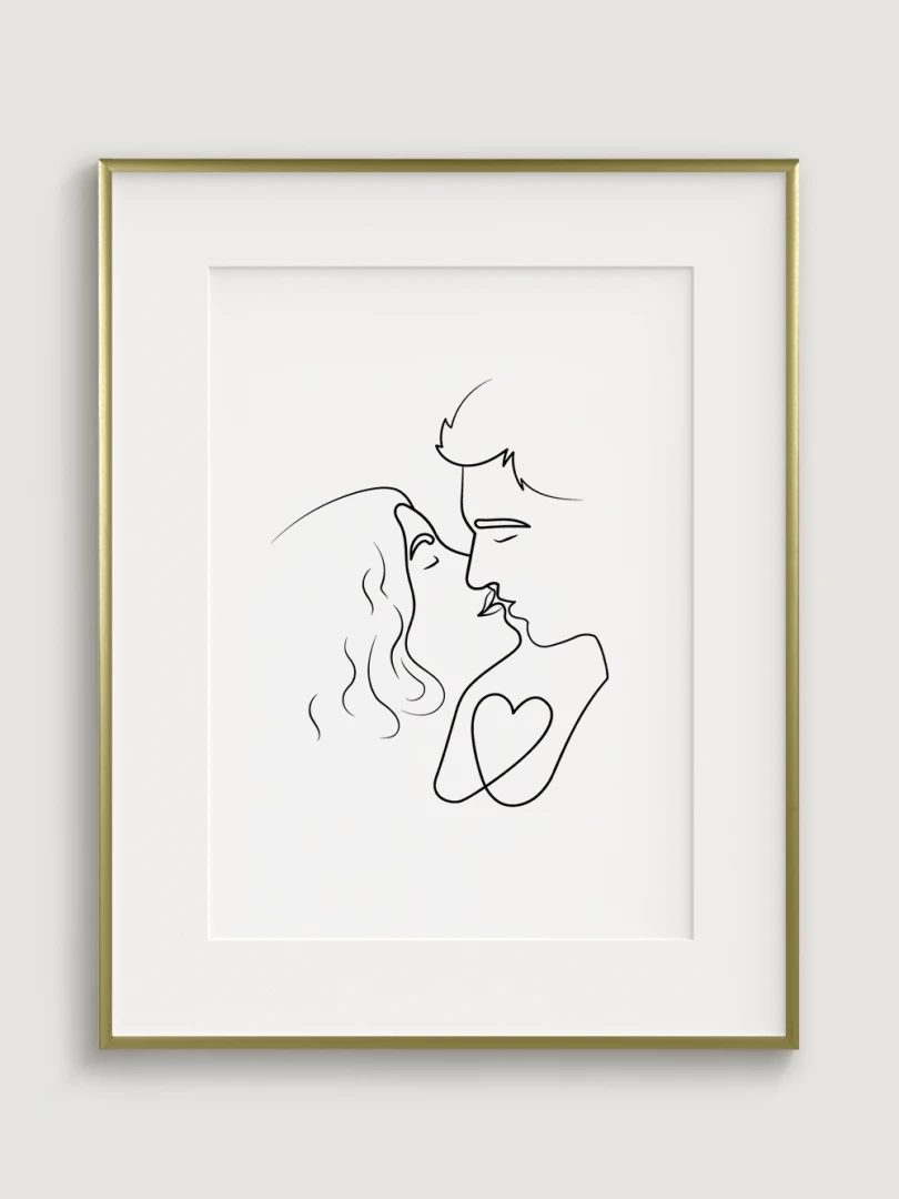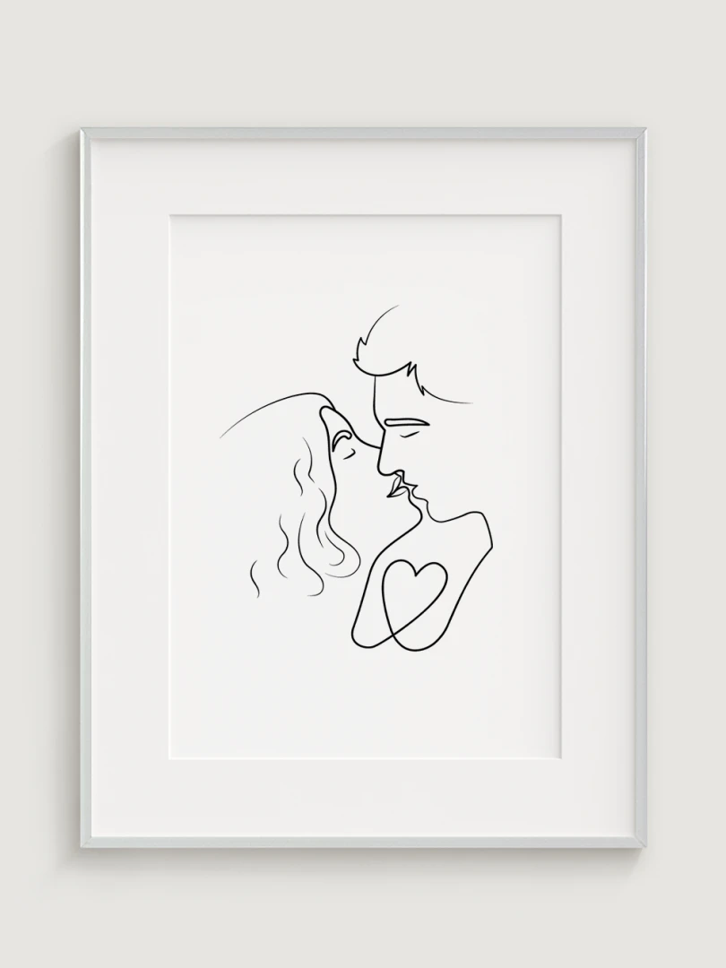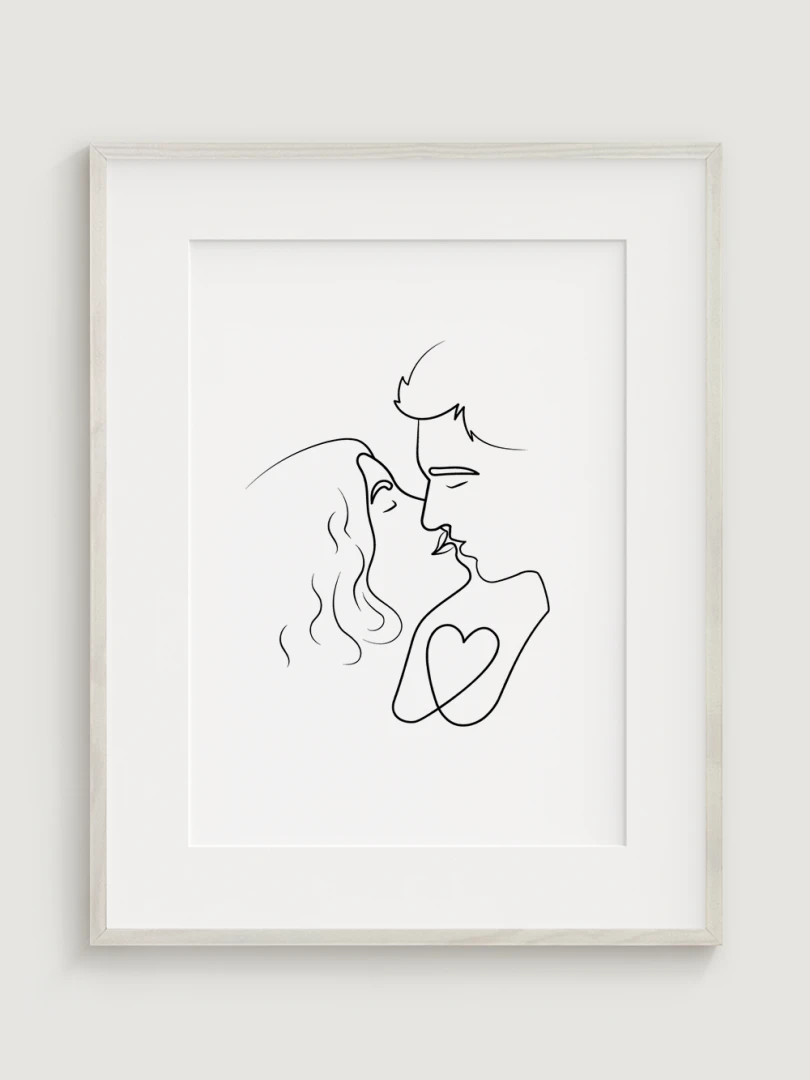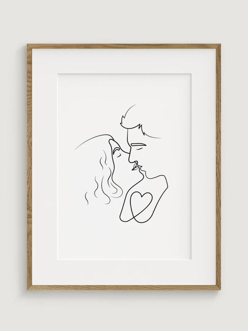 Jednoduchost printu zdůrazňuje intimní moment, což z něj činí silný, ale nenápadný vyjádření romantické spojitosti.