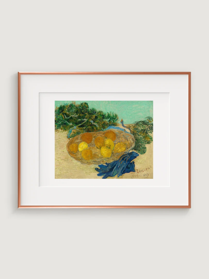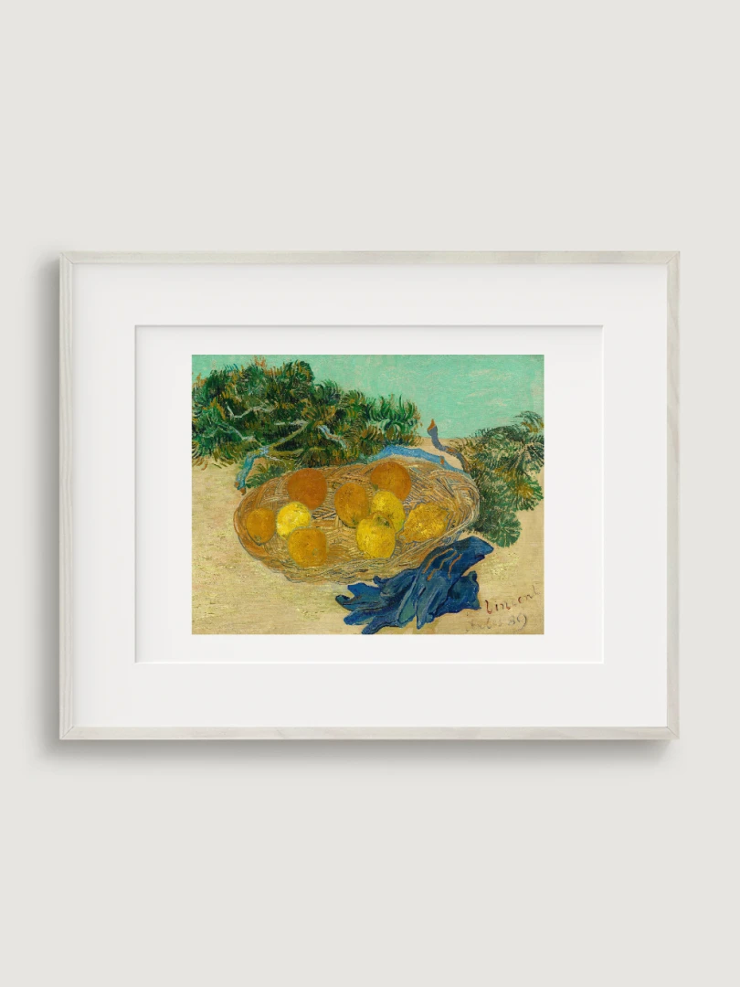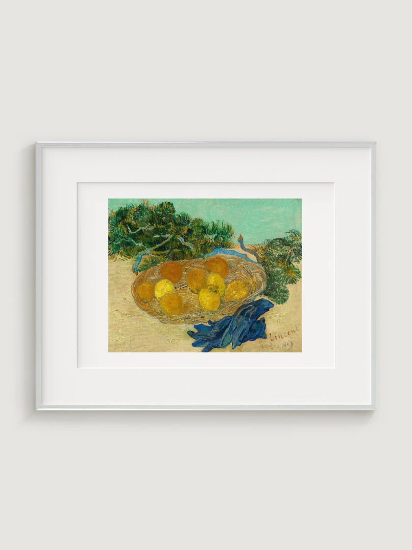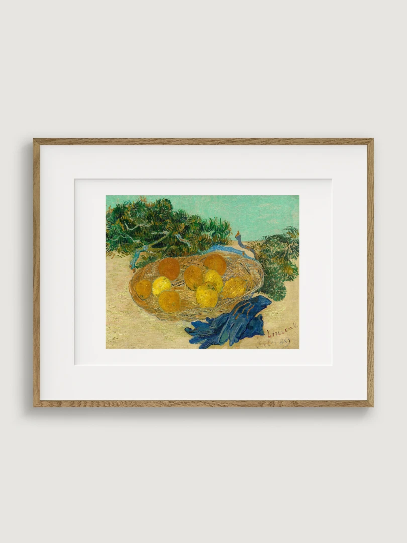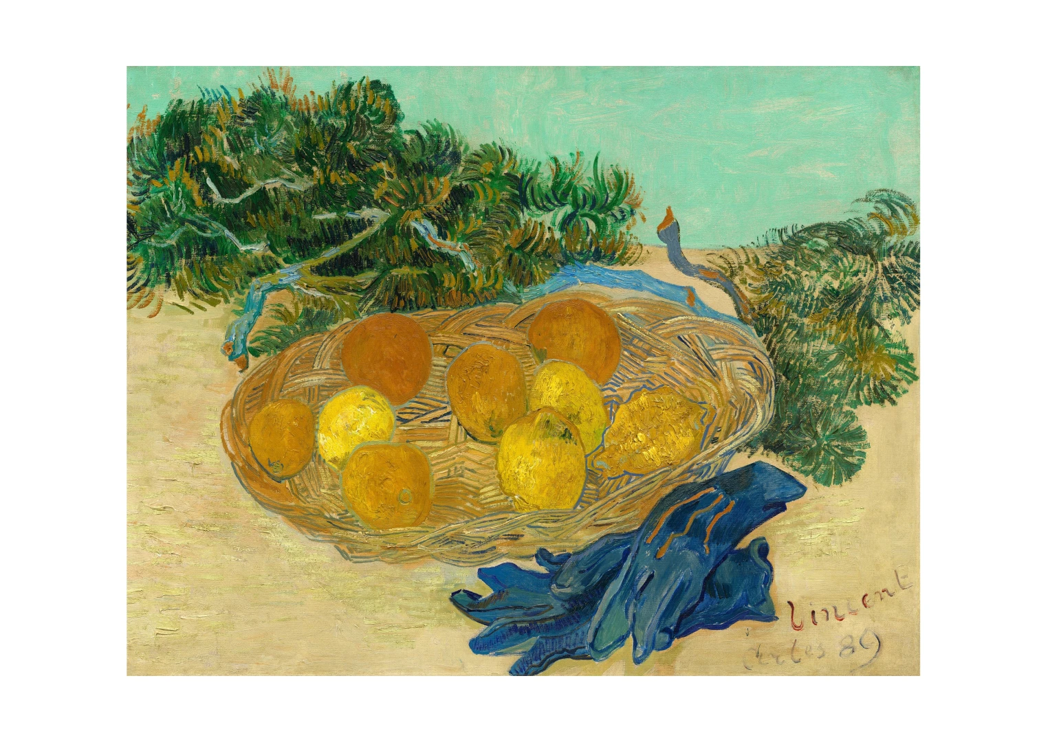 Představujeme vám tento nádherný umělecký tisk s názvem „Zátiší s pomeranči a citrony s modrými rukavicemi“ od legendárního nizozemského umělce Vincenta van Gogha.