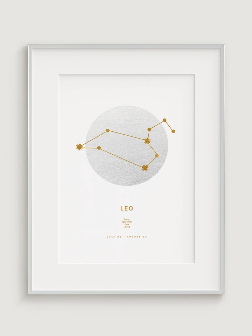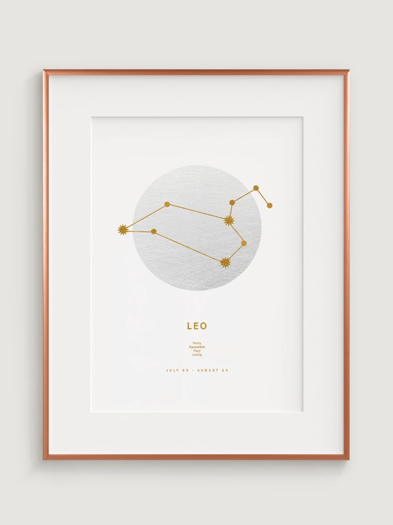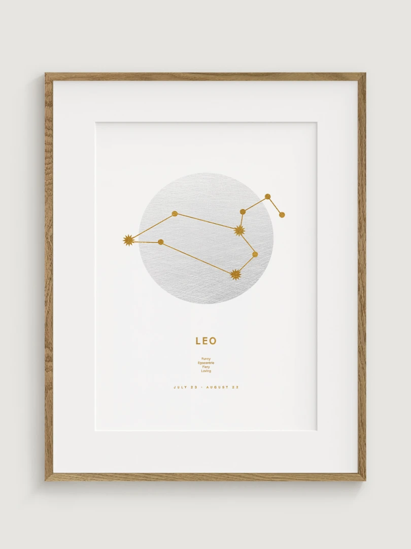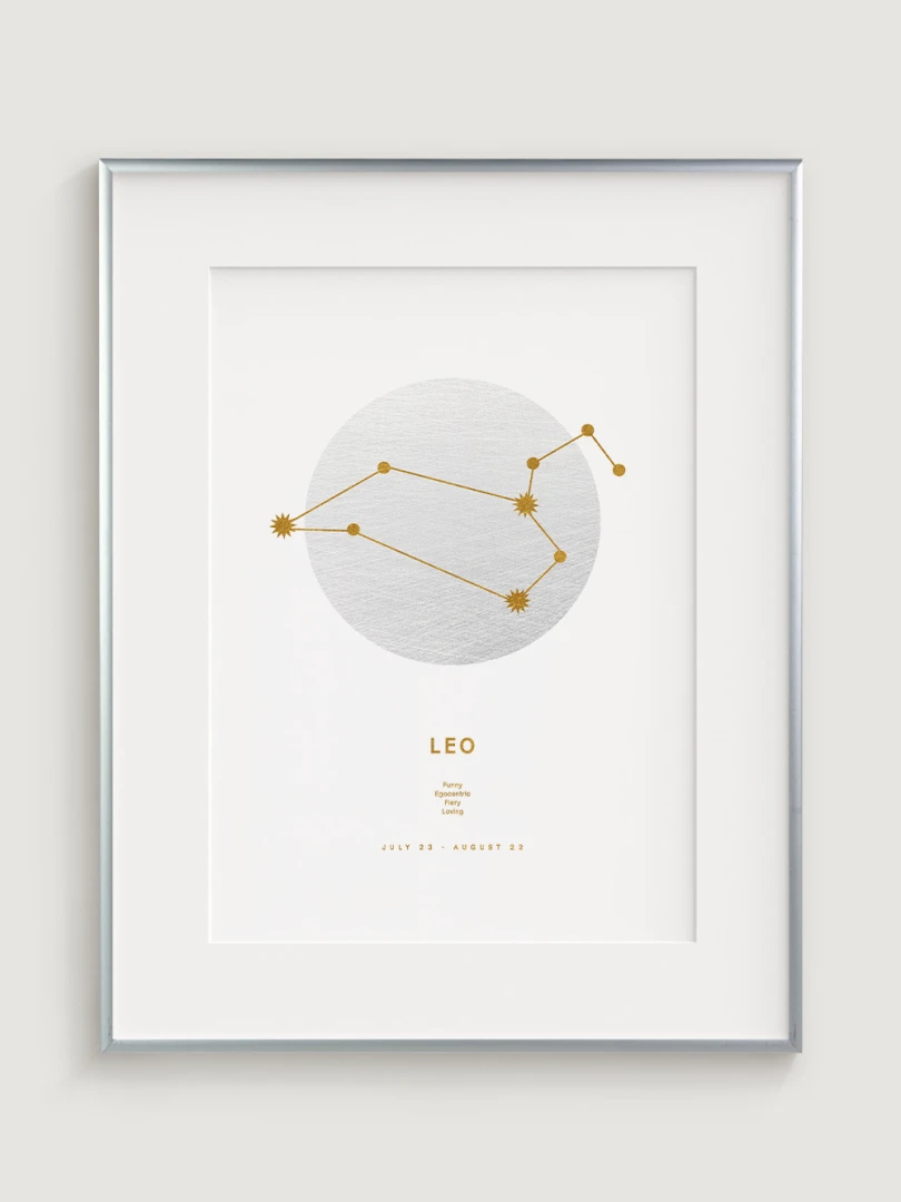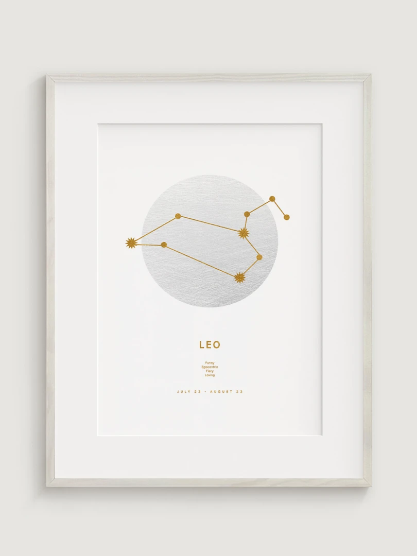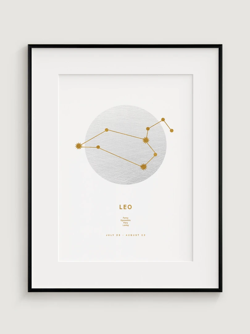 Toto znamení zvěrokruhu je známé svou odvahou, sebedůvěrou a přirozeným vůdcovstvím, které jsou nádherně ztvárněny v minimalistickém designu, v němž se snoubí moderní estetika s astrologickou symbolikou. Odvážná a energická paleta obohatí každý prostor, takže tento print je ideálním dárkem pro osoby narozené ve znamení Lva nebo stylovým doplňkem vaší domácnosti.